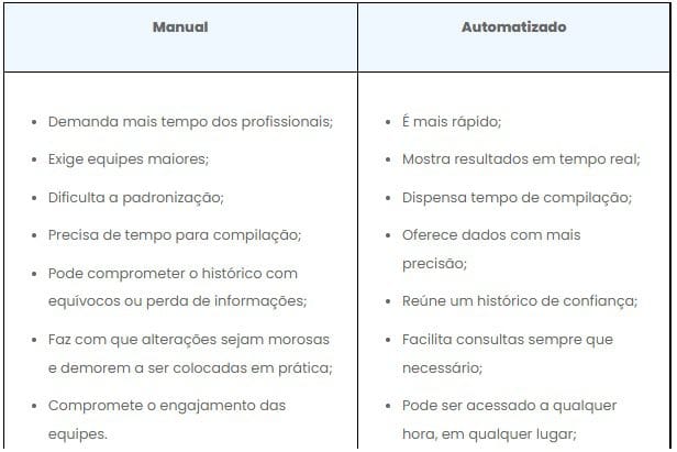 O tempo de intervalo entre as coletas e o canal de transmissão das informações têm muito a influenciar na efetividade de um Sistema de Gestão da Qualidade. Abaixo, comparamos as características entre os métodos manual e automatizado:
