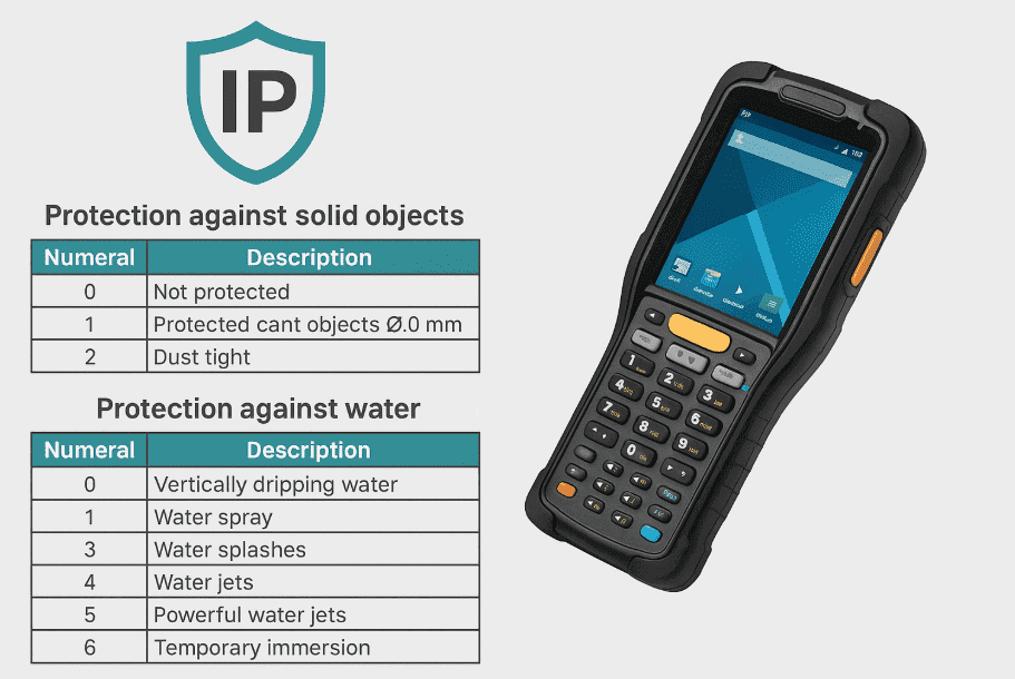 Esse é um dos graus de vedação mais altos e comuns em coletores de dados robustos usados na indústria e no varejo.